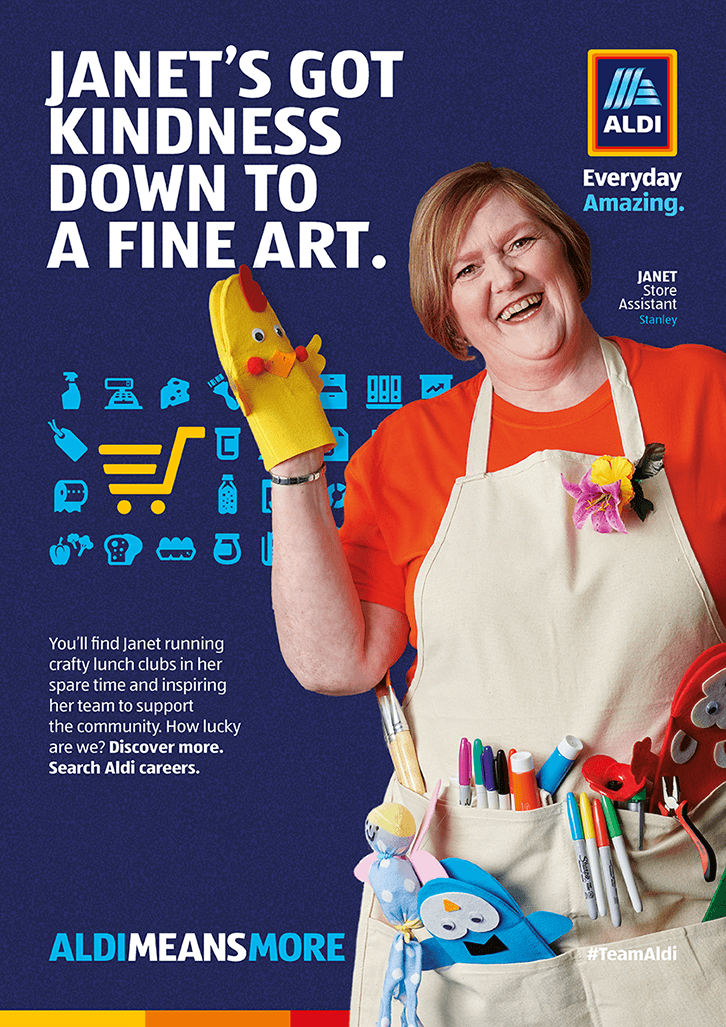 By saying ‘Aldi Means More’. It gave us the freedom to talk about how much more Aldi can give to a potential colleague, and how much more they’ll give in return. The EVP was developed during lockdown, which was challenging but also a blessing in disguise. There were so many inspirational stories of Aldi people going above and beyond, all of which backed up what we were saying. We also proved the EVP by speaking to different Aldi people in different roles and regions. And we brought their authentic stories to life with intriguing headlines and quirky photography.